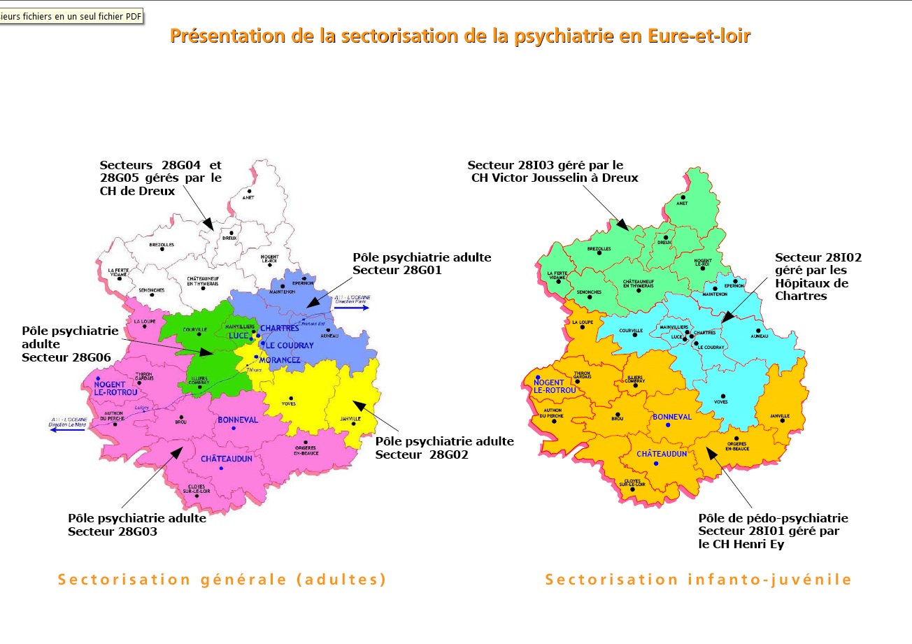 Depuis 1960, la psychiatrie est organisée en secteurs géo-démographiques dotés chacun d'une équipe pluridisciplinaire et d'un ensemble de structures graduées dont le centre médico-psychologique (C.M.P.) est le pivot. Le centre hospitalier collabore dans cette mission avec les hôpitaux généraux de Chartres pour les enfants et adolescents et de Dreux pour les patients du nord du département.